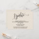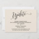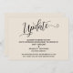 La distinción de este conjunto se debe a la fuente de escritura elaborada y giratoria utilizada para las frases de acento. En el caso de que necesite informar a sus invitados que su boda ha sido cancelada, esta tarjeta ofrece una opción elegante. En esta pieza, se utilizó la fuente de caligrafía para crear un gráfico que representa la palabra "Actualización". Utilice los campos de la plantilla para agregar sus datos personales y hacer que este diseño sea suyo. El fondo se puede cambiar a cualquier color que prefiera. Por favor, comuníquese con nosotros para cualquier solicitud especial o para obtener ayuda para personalizar. // 98 //