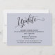 La distinción de este conjunto se debe a la fuente de escritura elaborada y giratoria utilizada para las frases de acento. En el caso de que necesite informar a sus invitados que su boda ha sido cancelada, esta tarjeta ofrece una opción elegante. En esta pieza, se utilizó la fuente de caligrafía para crear un gráfico que representa la palabra "Actualización". Utilice los campos de la plantilla para agregar sus datos personales y hacer que este diseño sea suyo. El fondo se puede cambiar a cualquier color que prefiera. Por favor, comuníquese con nosotros para cualquier solicitud especial o para obtener ayuda para personalizar. // 98 //