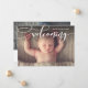 Este sencillo anuncio de la moda con el nacimiento de una foto muestra una extraña escritura con letras que resaltan su nueva llegada. Añade una foto adicional a la parte posterior y detalles. Seleccione una forma cortada, papel texturado o papel ultradelgado para un toque especial.