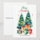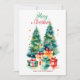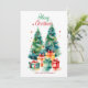 Tarjeta de vacaciones de árbol de Navidad en acuarela elegante con un festivo árbol de Navidad en acuarela adornado con adornos de vidrio y rodeado de regalos envueltos. Personalice la tarjeta agregando un saludo personalizado y el nombre de su familia. La tarjeta de vacaciones del árbol de Navidad muestra al reverso su mensaje en letra oscura y fondo blanco.