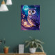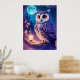 El búho mágico tiene patrones intrincados en sus plumas, lo que le da un aspecto místico. Está rodeada de luna, estrellas brillantes o símbolos brillantes, parece una aventura mágica. Se han utilizado amarillos suaves y vibrantes morados, azules y dorados para crear detalles y un efecto de estilo cómico.