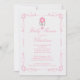Nuestra elegante invitación a la ducha de bebé cuenta con un elaborado marco de pergamino rosa elegante y elegante, decorado con un fondo blanco crujiente con un clásico y elegante rattle rosa y una imagen impresa en un arco blanco para una dulce ducha de bebé. En la parte trasera de nuestra ducha para bebés, el color rosa combina con el resto para darle un toque especial. Visita nuestra tienda para encontrar tarjetas de agradecimiento, sellos postales y pegatinas.