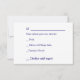 Esta tarjeta de respuesta boda presenta un marco de borde plateado de bonito con adornos de esquina. El texto de su personalizado está en plata en el centro. Las imágenes y el texto se colocan sobre un fondo de gradiente azul real que casi brilla! La parte posterior de la tarjeta de respuesta es blanca para que el encuestado marque fácilmente, e incluye un área para las opciones del menú. Todo el texto es personalizable, y si necesitas ayuda, por favor no dudes en contactarnos a través de nuestra dirección de correo electrónico de la tienda. ¡Siempre estamos felices de ayudar! Esta tarjeta coincide con las invitaciones elegantes de la boda de marco de plata azul en nuestra tienda.