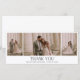 Celebra tu día especial con un toque elegante enviando esta elegante tarjeta de agradecimiento de Boda de tres Collages de fotos. Diseñada para mostrar tus momentos favoritos, esta tarjeta presenta un bello collage de tres de tus preciadas fotos bodas, lo que hace de esta una forma personalizada y sincera de expresar tu gratitud. La sofisticada disposición combina elegancia atemporal con un estilo moderno, perfecto para las parejas que desean que su mensaje de agradecimiento sea tan memorable como su gran día.