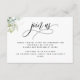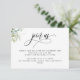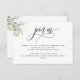 Elegante boda "Únete a nosotros" detalles de la recepción carta del recinto con la posibilidad de añadir cualquier información después de la ceremonia que quieras. Caligrafía escrita a mano moderna y tipografía en bloques. Elegante, limpio y sencillo. Delicados detalles de eucaliptos verdes tanto en la parte delantera como en la parte trasera, en tonos suaves verdes y azules. Parte de nuestra colección "Elegante vegetación Eucalyptus Boda and Events" con una variedad de productos de coordinación disponibles.
