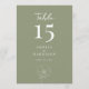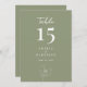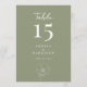 Este elegante y sabroso número de mesa de la recepción de bodas florales 5x7 muestra un gran número de mesa en blanco sobre un fondo verde sabio, con tipografía moderna y caligrafía de escritura, y un acento floral de arte lineal. Es totalmente personalizable con el número de tabla, los nombres de la pareja y la fecha del boda.
