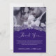 Esta elegante tarjeta de agradecimiento de boda morado une romance y sofisticación de una manera atemporal. Una bonita fotografía de una pareja corona la parte superior, realzada con un diseño floral adamascado adornado en lujosos tonos violetas. El elegante guión de "Gracias" brilla sobre el fondo morado profundo, acompañado de un sincero mensaje de gratitud. En la parte inferior se destacan los nombres de la pareja y la fecha del boda, lo que hace de la tarjeta un regalo muy preciado. Con su rica paleta de colores y su diseño clásico, esta tarjeta es perfecta para bodas que celebran la elegancia, el amor y los atesorados recuerdos.