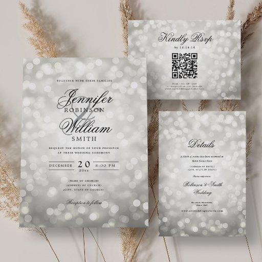 Elegante Bokeh Wedding QR RSVP Luces Silver