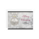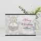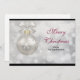 Tarjeta plana de vacaciones de Navidad personalizada con su nombre y mensaje en el reverso. Diseñada con una composición mágica de fiestas. Con una bola de Navidad de plata con decoraciones de copos de nieve y terminada con un lazo de plata bonito. El fondo es una ilustración de luces bokeh de plata con estrellas elegantes esparcidas por todas partes.