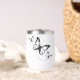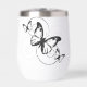 Esta imagen muestra un elegante vaso de vino aislado en blanco con una tapa de acero inoxidable, con un diseño elegante en blanco y negro de tres mariposas que giran con gracia entre patrones circulares punteados. El aspecto minimalista y artístico lo convierte en una moda y un accesorio funcional para los amantes del vino, perfecto para picnics, reuniones al aire libre o como un regalo para alguien que aprecia delicados diseños inspirados en la naturaleza.