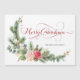 Hermoso acuarela de invierno estilo floral con rosas rosas rosas, pinos, ramas de abetos, holly & eucalipto con elegante saludo rojo de Feliz Navidad con letra caligráfica manuscrita con flores, con campo de texto para personalización.