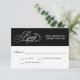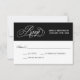 Una preciosa y elegante tarjeta RSVP de boda con un hermoso guión de caligrafía, texto RSVP en plata sobre un contraste de fondo negro. Edite la fecha de respuesta con la fecha deseada de RSVP. Hay otro diseño de tarjeta RSVP disponible en esta colección de bodas que incluye selecciones de entradas de personalizable.