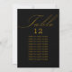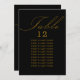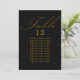 Tarjeta de asiento de mesa de boda negro y dorado con caligrafía elegante y tipografía editable. Diseño minimalista sencillo y moderno que se adapta a los colores bodas. La tabla está escrita a mano y la plantilla está lista para que edite el número de tabla y la lista de asientos de invitados.