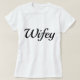 Camiseta femenina de Wifey Elegant Black Script. Esta es una camiseta básica para mujeres. La camisa es una camiseta blanca de manga corta. La palabra Wifey está en la parte superior del polo. Wifey está en un elegante guión negro. La mujer está delante de la camiseta. Puede cambiar el texto haciendo clic en el botón Personalizar.