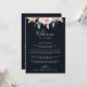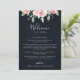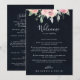 Esta elegante carta de bienvenida color rosa, floral y boda, es perfecta para un boda moderno. El diseño presenta rosas de color rosa a mano y peonías con hojas verdes y grises de fondo azul oscuro, inspirando la belleza natural. Personalice la parte delantera con un mensaje de bienvenida para sus invitados y sus nombres. Personalice la parte posterior con la programación de eventos y otra información útil.