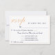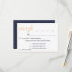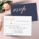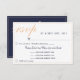 Tarjeta RSVP elegante y personalizada con una selección de menú para un boda. Es perfecto para una boda moderna y elegante. El texto está en un guión moderno y en color melocotón. El fondo es de color azul oscuro. Esta tarjeta de respuesta boda le pregunta a sus clientes qué comida les gustaría en la recepción y el número de menús. Puede cambiar la información de la tarjeta para que se ajuste a sus necesidades. Esta tarjeta RSVP coincide con todos los elementos de la colección de Bodas azules de la medianoche amarilla, que puede encontrar debajo de esta tarjeta.