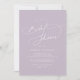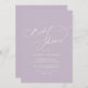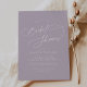 Estas elegantes invitaciones a la ducha de novias púrpura son perfectas para una simple ducha de boda. El moderno diseño minimalista presenta una caligrafía violeta de lavanda pastel intemporal y romántica con estilo de cuento de hadas bohemias, perfecta para una boda en primavera o verano en el jardín.
