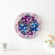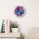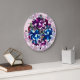 Reloj de pared con fotos de flores rosa elegantes, moradas y azules. Diseño con color de fondo personalizado. Hermosa decoración.
