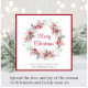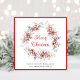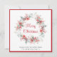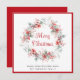 Elegante tarjeta de saludo de vacaciones con una corona acuática de flores y bayas rojas y vegetación de temporada. "Feliz Navidad" está escrito en un elegante guión rojo. Personalice su saludo y nombre en una tipografía sencilla y moderna.