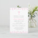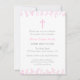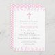 Una moderna y elegante invitación a la cristiandad o al bautismo en rosa pastel. El diseño tiene la cruz sagrada en el centro y las hojas decorativas para la frontera. En la página de atrás se muestra un patrón de zigzag color rosa y blanco pastel. Personalice fácilmente los detalles del evento para bautizar a la bebé.