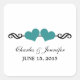 Elegantes y dulces pegatinas de bodas de corazón con un elegante borde giratorio adornado con un par de corazones turquesa. Estos modernos stickers de boda son la elección perfecta para una moda y una boda elegante. Fácil de personalizar, simplemente agregue los detalles de su boda en los campos de texto proporcionados. Haga clic en "Personalizar" para buscar opciones de personalización adicionales.