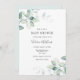 Invitación a la ducha para bebés con ramas de eucaliptos acuáticas. Personalice su información o haga clic en "Haga clic en el personalizar más adelante" para editar estilos de fuente, tamaño y colores.