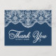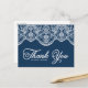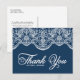Tarjeta postal de agradecimiento elegante con encaje de brocado botánico blanco sobre fondo azul marino. Personalice añadiendo nombres, mensaje y detalles. Esta elegante tarjeta de agradecimiento es perfecta para bodas, despedidas de soltera, cumpleaños y mucho más.