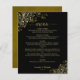 Estos bonitos menús bodas son sencillos, elegantes y elegantes, a la vez que asequibles y asequibles. Presentan un diseño elegante y glamuroso con encaje de Relieve metalizado falso dorado y caligrafía de escritura sobre un fondo negro. El dorso es un bonito color dorado de mármol.