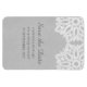 Sencillo y sofisticado Elegant Lace Save the Date Premium Flexi Magnet con un motivo doily de encaje blanco sobre un fondo de papel pintado de imitación gris claro. Este imán clásico y elegante es perfecto para anunciar un boda rústico. Fácil de personalizar con los detalles de su boda. Haga clic en "Personalizar" para encontrar más opciones de personalización.