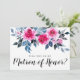 Elegant Will You Be My Matron Of Honor card design con rosas de acuarela rosa brillante, follaje azul y gris sobre un fondo blanco.