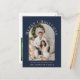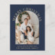 Elegante postal de vacaciones azules con tu foto en un marco de arco, "Feliz Navidad" en la tipografía clásica de los serif de oro y tu nombre y un saludo de temporada en una simple y moderna tipografía de oro. Añade una foto adicional en la parte de atrás y tu saludo personalizado a amigos y familiares.