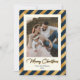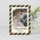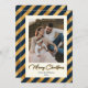 Elegante foto azul y dorada Feliz Navidad con un moderno tipo de letra y rayas de escritura. Personaliza fácilmente esta tarjeta de vacaciones de Relieve metalizado dorado de lujo con tu foto y un nombre familiar. El efecto Relieve metalizado dorado sólo se simula en las obras de arte.