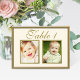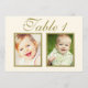 Las elegantes y únicas tarjetas de números de tabla de boda personalizadas incluyen fotos de la infancia del novio y la novia a una edad que corresponde con el número de tabla. Para personalizar: escriba el número de tabla, haga clic en "cambiar" por las fotos predeterminadas para cargar sus propias fotos digitales o escaneadas, y agregue esa tarjeta de número de tabla individual a su carrito de compras. Repita todos los números de tabla que necesite. Texto antiguo personalizado de guión dorado sobre un marfil claro (se puede personalizar) color de fondo.