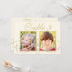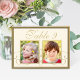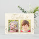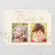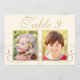 Las elegantes y únicas tarjetas de números de tabla de boda personalizadas incluyen fotos de la infancia del novio y la novia a una edad que corresponde con el número de tabla. Para personalizar: escriba el número de tabla, haga clic en "cambiar" por las fotos predeterminadas para cargar sus propias fotos digitales o escaneadas, y agregue esa tarjeta de número de tabla individual a su carrito de compras. Repita todos los números de tabla que necesite. Texto de guión de color dorado y marco de desplazamiento sobre un color de fondo de marfil claro.