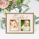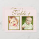 Las elegantes y únicas tarjetas de números de tabla de boda personalizadas incluyen fotos de la infancia del novio y la novia a una edad que corresponde con el número de tabla. Para personalizar: escriba el número de tabla, haga clic en "cambiar" por las fotos predeterminadas para cargar sus propias fotos digitales o escaneadas, y agregue esa tarjeta de número de tabla individual a su carrito de compras. Repita todos los números de tabla que necesite. Texto antiguo personalizado de escritura dorada sobre un ballet pastel pálido color de fondo rosa (se puede personalizar).
