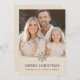 Añada un toque de elegancia a sus saludos de vacaciones con esta elegante tarjeta plana de fotos de la familia Merry Christmas. La parte delantera muestra tu preciada foto familiar enmarcada por un elemento de diseño metálico cepillado, mientras que una bandera clara adornada con un delicado copo de nieve dice: "Feliz Navidad, te envía alegría y alegría festiva". Gire la tarjeta para revelar el mensaje de su personalizado con un fondo ligero suave y atractivo. Comparte la calidez de la temporada mientras expresas tus sentidos sentimientos: "Que esta temporada de Navidades te traiga una alegría interminable, y que tu corazón se desborde de amor y recuerdos preciados. Esta tarjeta plana ofrece una manera personal y elegante de extender la alegría de las vacaciones y conectar con sus seres queridos cercanos y lejanos.