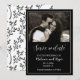 Esta elegante tarjeta de anuncio de compromiso con fotografía y letra script es perfecta para aquellos que prefieren un estilo minimalista. El diseño de la tarjeta presenta su foto favorita o la foto formal de compromiso sobre un fondo negro. Las palabras "Save the Date" y los nombres de los novios están hechos en una hermosa tipografía blanca y romántica. El resto está hecho en una simple tipografía blanca para seguir con el tema minimalista. Actualice la tarjeta con su información utilizando la plantilla fácil proporcionada. El reverso de la tarjeta tiene un elegante patrón de hojas en blanco y negro.