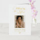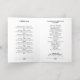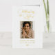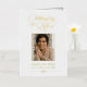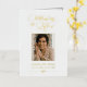 Programa funerario doblado en blanco y oro impreso con una foto de tu ser querido, su nombre y años de vida, y obituario.
