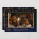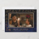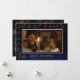 Hermosa tarjeta personalizada de festividad navideña en un fondo azul oscuro con pequeñas estrellas y patrones de copos de nieve alrededor del marco y en la parte posterior. Puedes reemplazar la foto por la de tu familia o de tu pareja. Puede actualizar todo el texto.