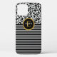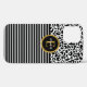 Un patrón de leopardo negro y blanco con rayas blancas y negras y un elegante monograma dorado y negro decoran esta caja de iphone. ¡Personalízalo por ti mismo o por un regalo! Diseñado para ti por Blackberry Boulevard.