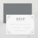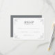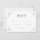 Esta elegante tarjeta de respuesta de boda presenta un diseño minimalista con líneas limpias y formas geométricas, creando un diseño equilibrado y simétrico. La paleta de colores incluye texto negro sobre fondo blanco, acentuado por rectángulos grises suaves que añaden profundidad sin abrumar la simplicidad del diseño. Los motivos de esquina estilizados compuestos por líneas que se cruzan mejoran la estética moderna, mientras que la fuente serif en negrita para "RSVP" añade sofisticación. Los campos personalizables permiten la personalización, lo que la hace perfecta para eventos formales, transmitiendo un tono que es a la vez accesible y refinado.