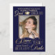 Una impresionante invitación de graduación ahorra el diseño de la plantilla de fecha con espacio para la foto incluida. Se puede aplicar a la escuela secundaria o a la universidad. Personalice el texto de acuerdo a sus preferencias. Elegante estilo con fondo azul real, tipografía curvada. Es la opción de añadir más información sobre el evento en el otro lado. Se puede editar fácilmente con la Herramienta de diseño.