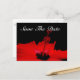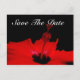 Hermosa fotografía de una flor de hibiscos de color rojo profundo sobre un fondo negro, con el texto blanco leyendo, Save The Date. Personalizar esta opción Guardar la tarjeta postal de fecha agregando sus nombres e información de boda en la parte posterior.