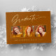 Impresionante, moderno y elegante invitación de graduación Relieve metalizado de oro 3 tarjetas fotográficas (elección de Relieve metalizado dorado de plata o rosa), con elementos de diseño de texto moderno con escritura caligráfica de tinta. Las fotos de los graduados se acentúan artísticamente con una frontera parcial delicada y minimalista. La parte posterior de la tarjeta ofrece espacios de texto personalizados para obtener información sobre su graduación o puede ser borrado si desea escribir un mensaje a mano. Naranja quemado - El color de roya o el personalizar del fondo fácilmente coinciden con el color primario de su escuela o con cualquier color de su elección. Perfecto para estudiantes de secundaria, universitarios y universitarios.