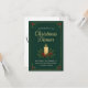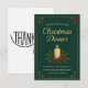 Organice un evento festivo memorable y elegante con esta Invitación a Cena de Navidad Elegante. El diseño presenta un hermoso fondo verde oscuro con patrones de pino sutiles y un delicado borde dorado. El centro de la composición es una cálida vela encendida rodeada de bayas de acebo clásicas y agujas de pino, que evocan una atmósfera festiva acogedora y tradicional.