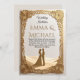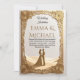 Una invitación de bodas de lujo con un marco floral dorado ornamentado, fondo de marfil, y elegante silueta de novia y novio en oro resplandeciente. Perfecto para parejas que buscan una elegancia atemporal y un estilo de papelería boda de primera calidad.