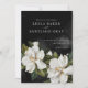 Elegante Invitación a la Boda doble cara diseñada con un ilustracion Magnolia Blanco sobre un fondo negro. Artículos coincidentes en el diseño del Fiesta Cava de nuestra tienda