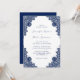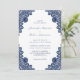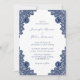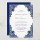 Estas elegantes invitaciones nupciales con encaje floral azul son perfectas para invitar a sus invitados a su fiesta de bodas rústica de color azul marino.