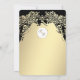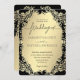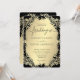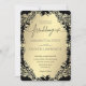 El diseño de esta invitación a la boda es una sofisticada mezcla de elegancia y encanto clásico. El fondo presenta un rico patrón de damasco negro, bellamente contrastado con un marco central dorado que resalta el texto. El borde ornamentado añade un toque de decoración atemporal, lo que lo hace perfecto para bodas formales. La tipografía combina escritura moderna con fuentes serif refinadas, creando un equilibrio entre estilo artístico y legibilidad. Esta invitación no sólo transmite los detalles del boda sino que también marca el tono para una celebración lujosa e inolvidable.