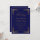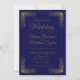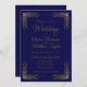 Personalizable elegante invitación a la boda de oro y encaje azul ornamentado.